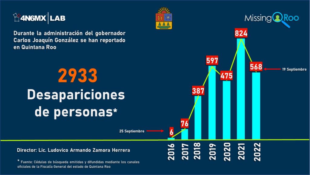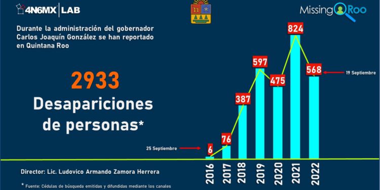 Las cifras no mienten y exponen una realidad sangrienta que en nada fortalecen la presencia de Carlos Joaquín González en el gabinete federal, ya que del 25 de septiembre de 2016 hasta el 19 de septiembre de 2022, periodo de gobierno de Carlos Joaquín en Quintana Roo, registra un total de 2 mil 933 personas desaparecidas. La mayoría en las ciudades de Cancún, Chetumal y Playa del Carmen.