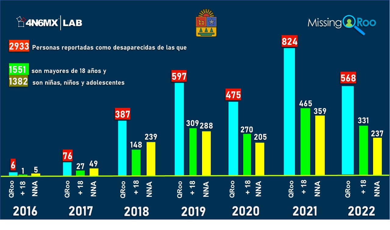 Cabe mencionar, de esas 86 desapariciones, 47 se mantienen como activos y 39 como no localizados. 36 de ellos fueron reportados desaparecidos en el municipio de Benito Juárez, 24 en Solidaridad, 11 en Othón P. Blanco, y 15 en los demás municipios.