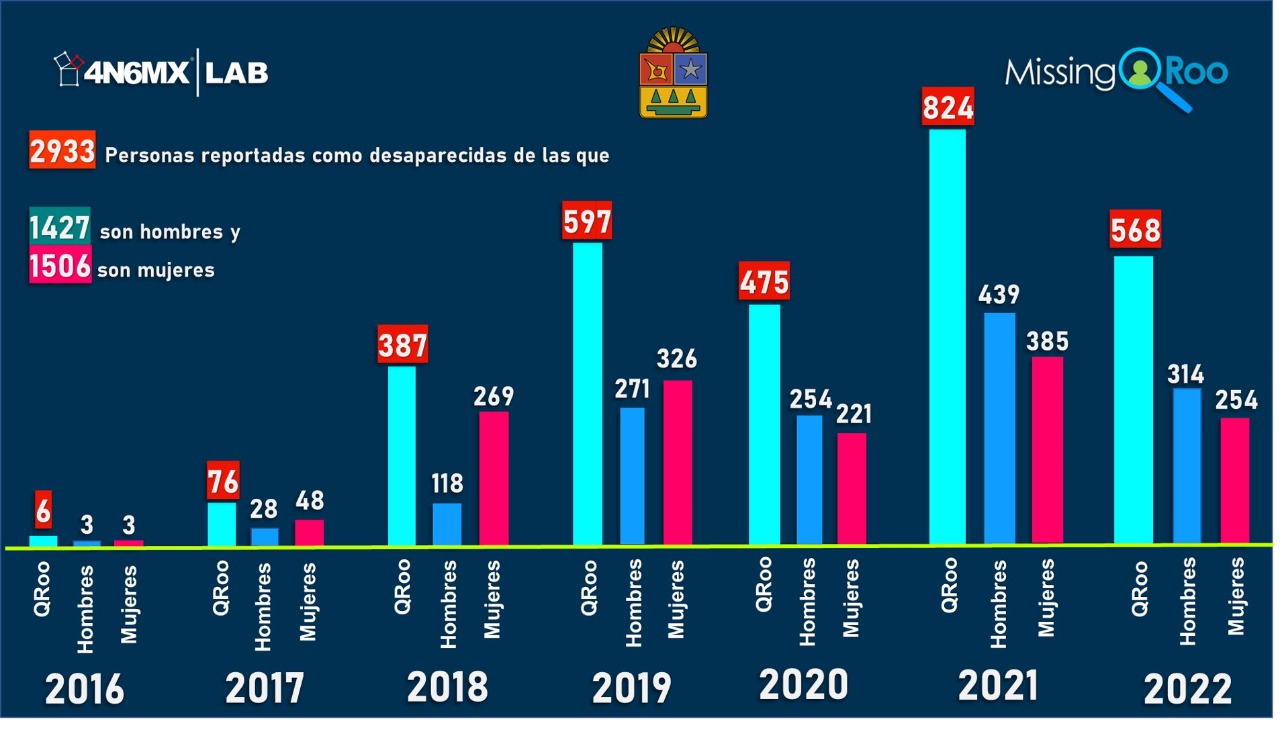 Fue el 2021 donde se registró el mayor número de desapariciones, con 824 casos; le sigue el 2019, con 597; en este 2022, suman 568; en el 2020 fueron 475 desaparecidos; en el 2018, fueron 387 casos; en 2017, un total de 76; y en el 2016 solamente 6.