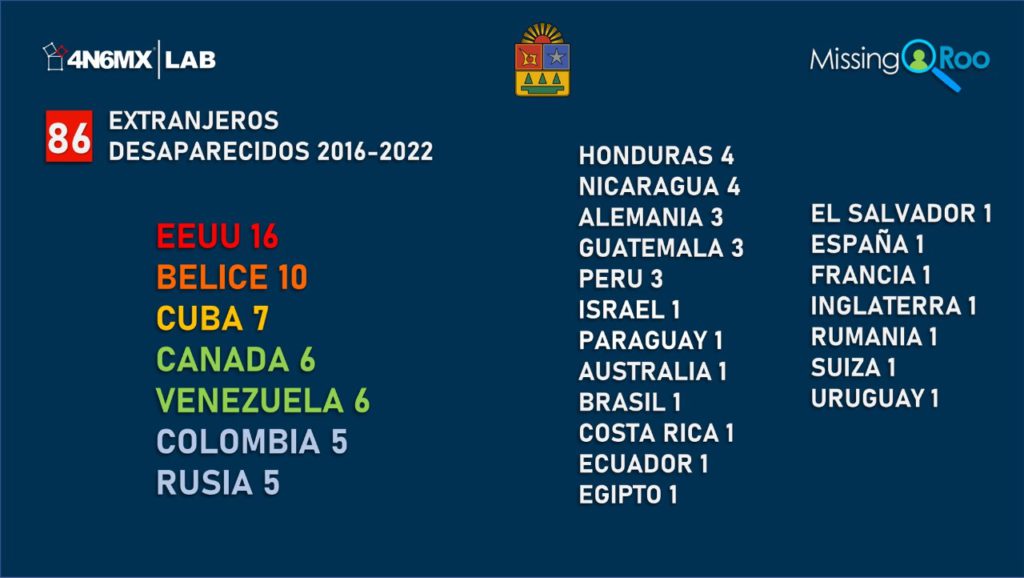 Estas desapariciones no son sólo de personas mexicanas, también se reporta la desaparición de 86 ciudadanos de origen extranjero, donde 16 son originarios de Estados Unidos, 10 de Belice, siete cubanos, seis canadienses, seis venezolanos, cinco colombianos, cinco rusos, cuatro hondureños, cuatro nicaragüenses, tres alemanes, tres guatemaltecos, tres peruanos y un israelí, un paraguayo, un australiano, un brasileño, un costarricense, un ecuatoriano, un egipcio, un salvadoreño, un español, un francés, un inglés, un rumano, un suizo y un uruguayo.