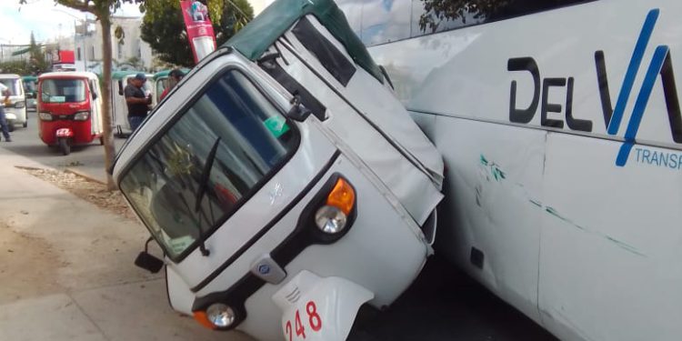 Un autobús de Autotransportes Ejecutivos del Valle Riviera Maya nuevamente se hace notar en las calles de Playa del Carmen al colisionar esta mañana un autobús de Del Valle con un mototaxi sobre Av. Garzas con Av. Constituyentes en el fraccionamiento Villas del Sol.