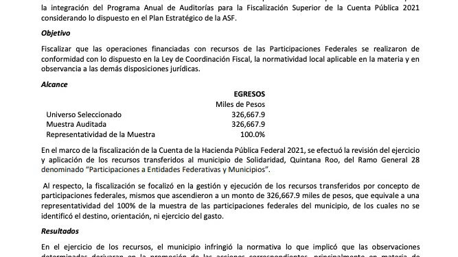 La ASF señala que el ejercicio de los recursos el municipio de Solidaridad infringió la normativa, principalmente en materia de adquisiciones, arrendamientos y servicios, por el total del importe transferido 326 millones 667 mil 875.