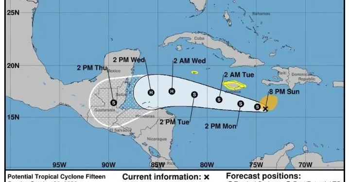 La Coordinación Estatal de Protección Civil (Coeproc) de Quintana Roo anunció el surgimiento del Ciclón Tropical ‘Quince’, el cual se mantiene en vigilancia, pues podría impactar en los próximos días en Belice, con un radio de afectación que abarca el sur del estado, de acuerdo con el pronóstico que arrojó el Centro Nacional de Huracanes (NHC) de Miami.