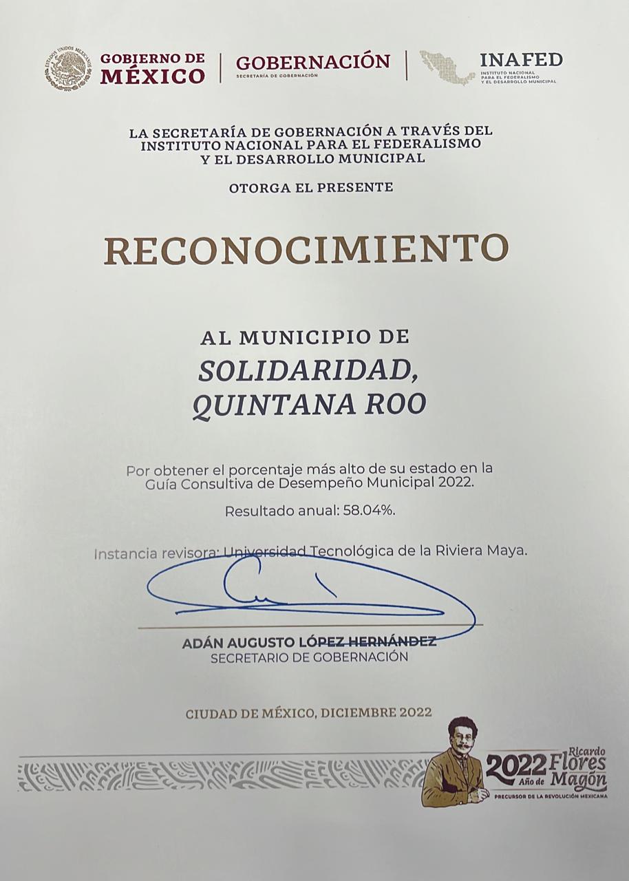 El gobierno que preside Lili Campos fue reconocido por el gobierno federal a través del Instituto Nacional para el Federalismo y el Desarrollo Municipal (INAFED) por obtener durante el 2022 el porcentaje de 58.4%, el más alto del estado de Quintana Roo en la Guía Consultiva de Desempeño Municipal.