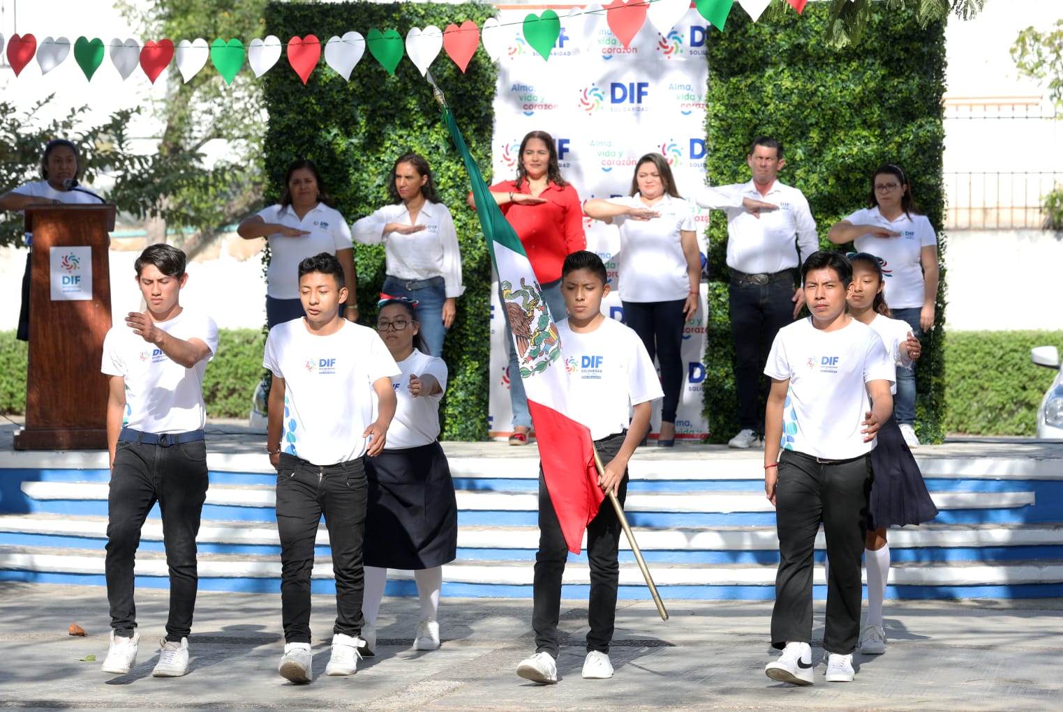 La directora general del DIF, Adriana Cazales Durán expresó que la bandera es el símbolo de nuestra identidad, de lo que somos, por lo que ver la participación de las y los estudiantes es motivo de orgullo, ya que son quienes continuarán el legado que dejaremos.