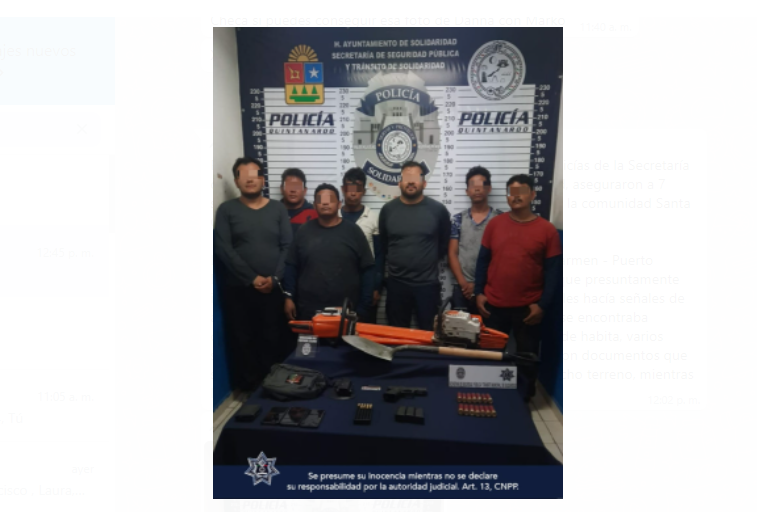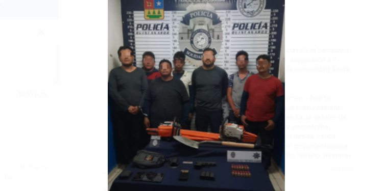 Luego de ser identificados por varios testigos, Medel “N” de 44 años de edad y Jesús “N” de 37 años de edad, ambos originarios de Campeche, Juan “N” de 49 años de edad y Alan “N” de 31 años de edad, ambos originarios de la Ciudad de México, Benjamín “N” de 30 años de edad y Luis “N” de 23 años de edad, ambos originarios de Veracruz y Jorge “N” de 41 años de edad, originario de Oaxaca, fueron asegurados en posesión de 1 arma de fuego con cargador y 14 cartuchos, 2 cargadores con 14 cartuchos, 28 cartuchos, 1 porta arma y 2 motosierras.
