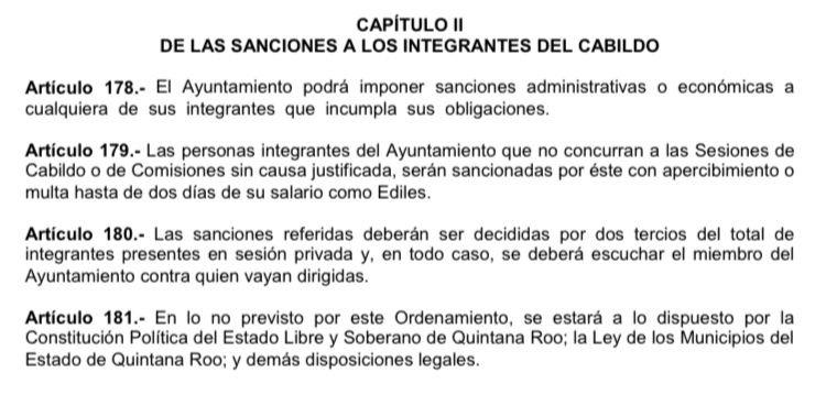 Cabe mencionar, de acuerdo al Capítulo 2, de las Sanciones a los Integrantes del Cabildo, del Reglamento Interno del Ayuntamiento de Solidaridad, en el artículo 178 establece que, “el Ayuntamiento podrá imponer sanciones administrativas o económicas a cualquiera de sus integrantes que incumpla sus obligaciones”.