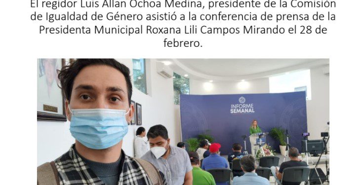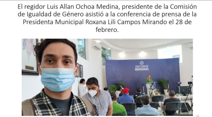 Llama la atención que, en uno de sus informes de actividades, presume con una de estas selfies haber asistido a la conferencia de prensa de la Presidenta Municipal Roxana Lili Campos Miranda el 28 de febrero; es decir, fue a un evento que es exclusivo para los medios informativos, y que en nada se relaciona con su labor como concejal.
