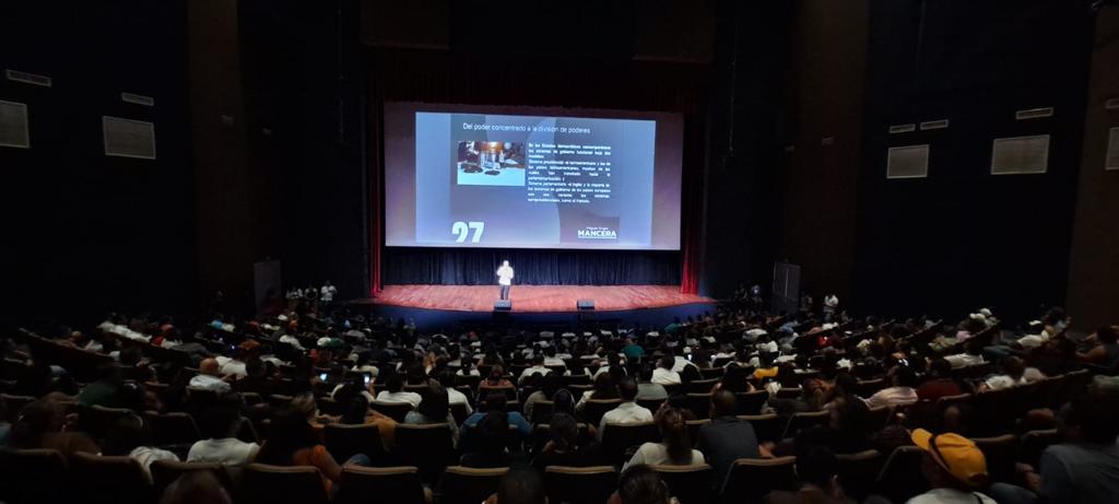 La conferencia magistral, celebrada posteriormente en el Teatro de la Ciudad, registró lleno total, y en ese espacio se dieron cita diversos sectores de la sociedad como el equipo de béisbol de la Zona Maya, “Las Diabillas”, que como muestra de aprecio le obsequiaron un guante de béisbol al senador.