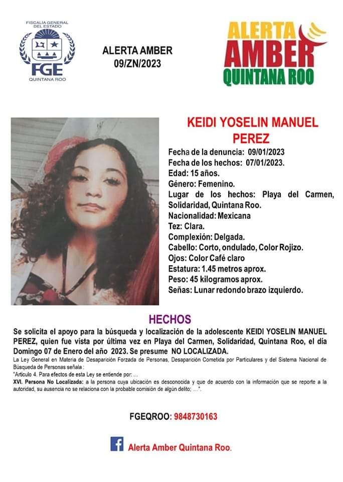 Keidi Yoselín Manuel Pérez 15 años fue vista por última vez por su familia el pasado 7 de enero de 2023 en Playa del Carmen, Quintana Roo.