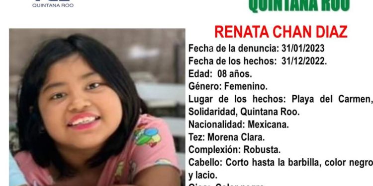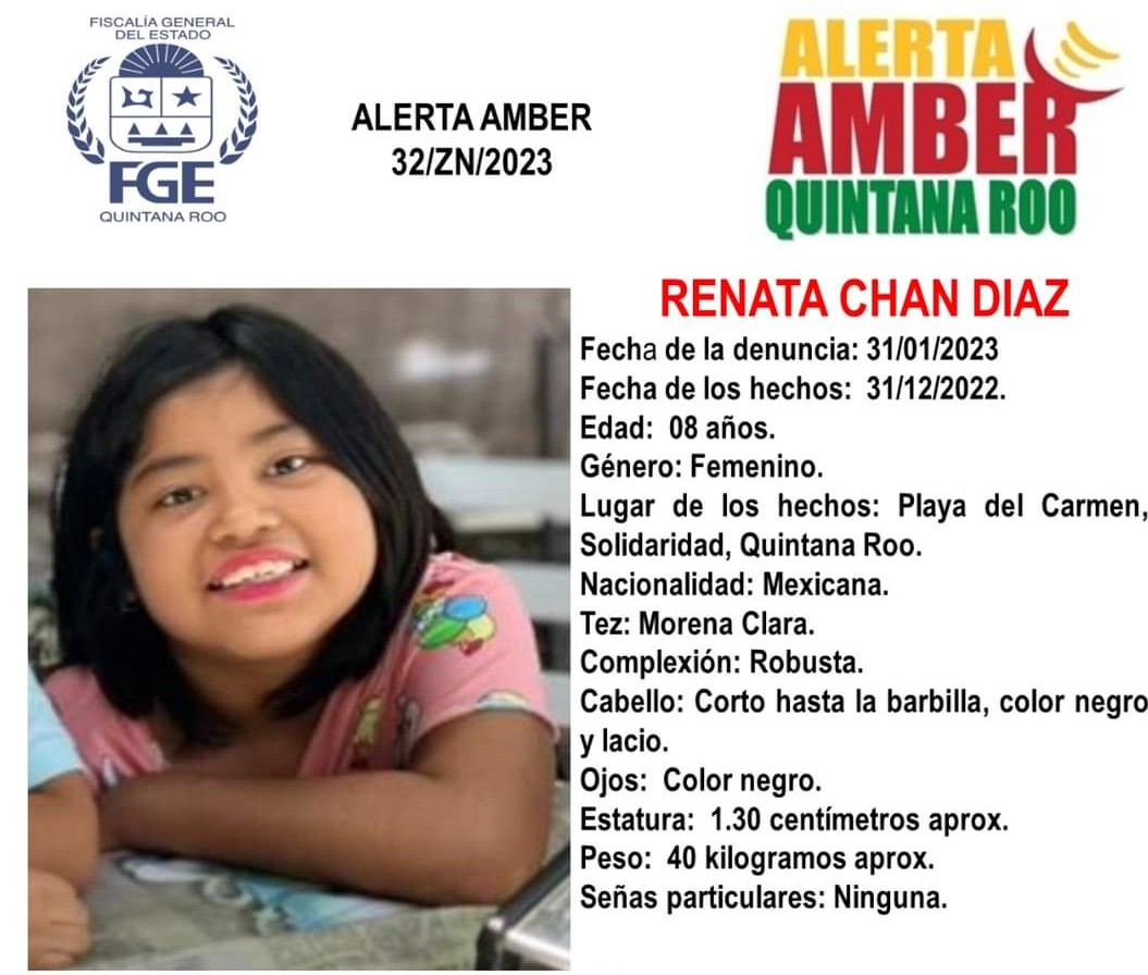 Renata Chan Díaz de 8 años fue vista por última vez por sus familiares el pasado 30 de diciembre de 2022 en Playa Del Carmen, Quintana Roo.