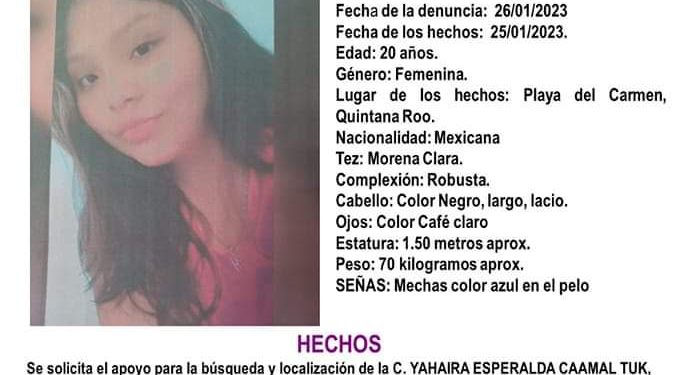 Yahaira Esmeralda Caamal Tuk de 20 años fue vista por última vez por sus familiares el pasado 25 de enero de 2023 en Solidaridad, Quintana Roo.