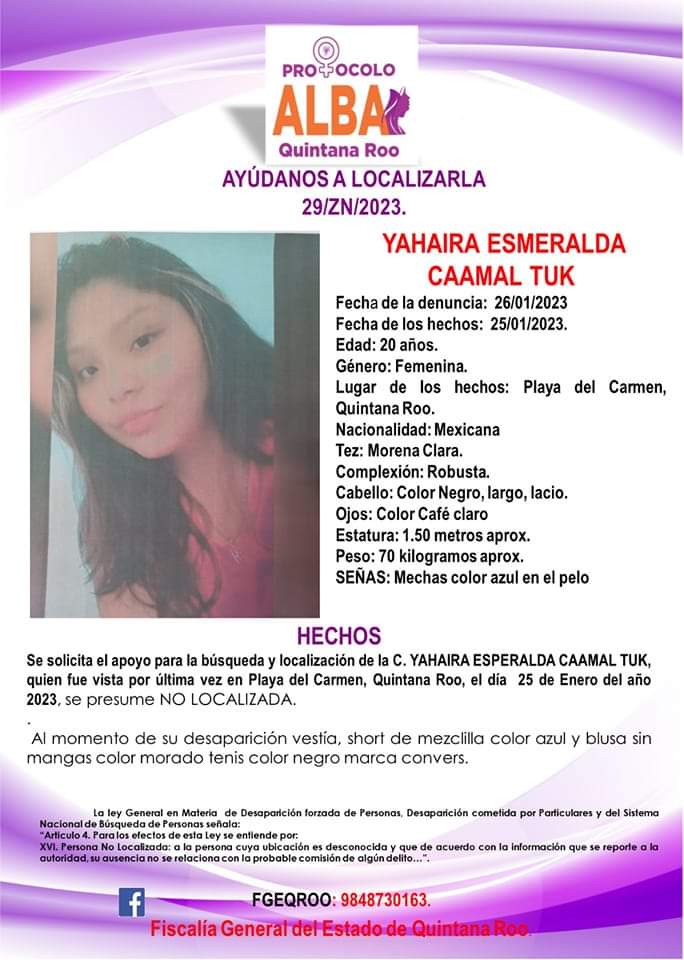 Yahaira Esmeralda Caamal Tuk de 20 años fue vista por última vez por sus familiares el pasado 25 de enero de 2023 en Solidaridad, Quintana Roo.