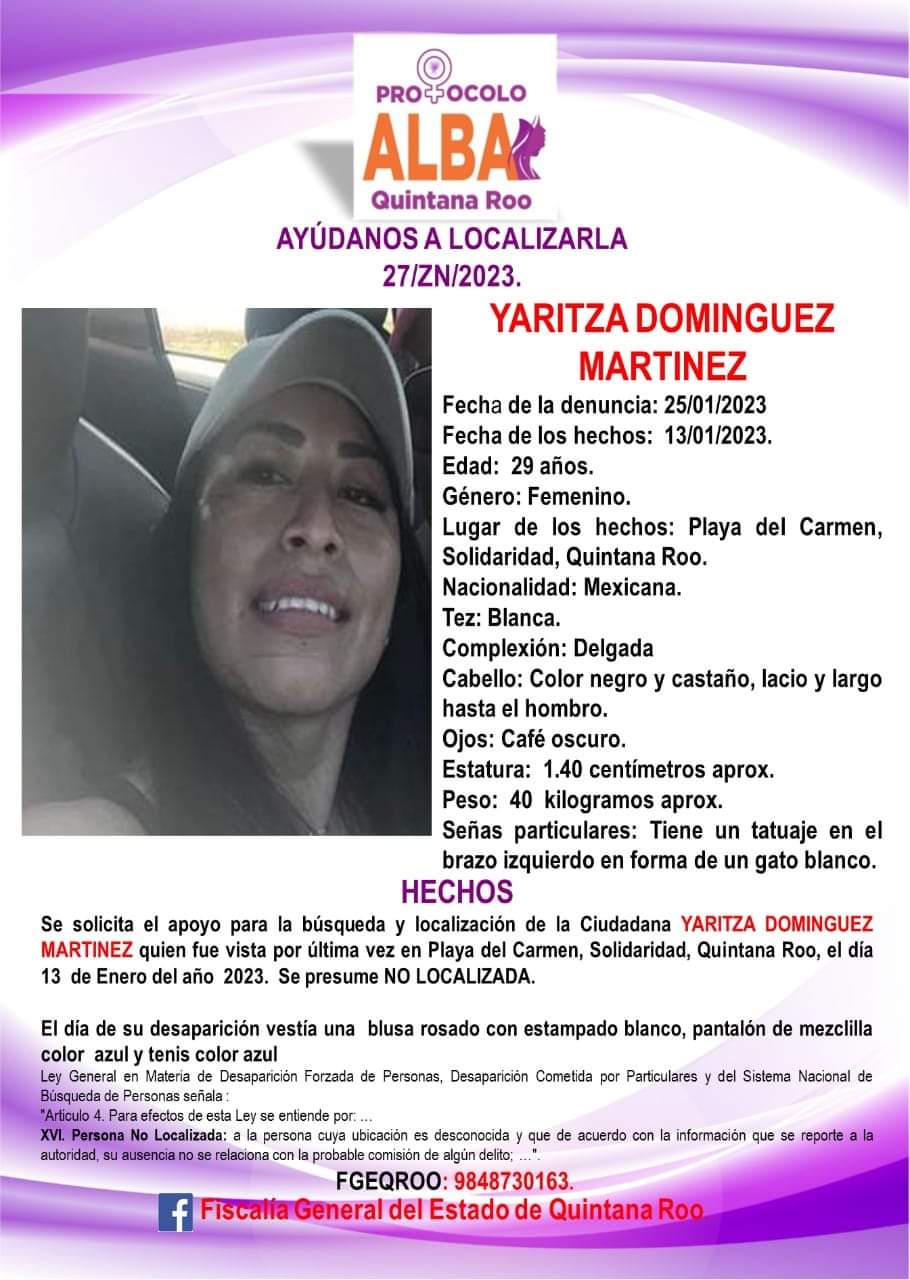Yaritza Domínguez Martínez de 29 años fue vista por última vez por sus familiares el pasado 13 de enero de 2023 en Playa del Carmen, Quintana Roo.