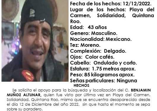 Benjamín Muñoz Altunar de 43 años fue visto por última vez por sus familiares el pasado 12 de diciembre de 2022 en Playa del Carmen, municipio de Solidaridad en Quintana Roo.