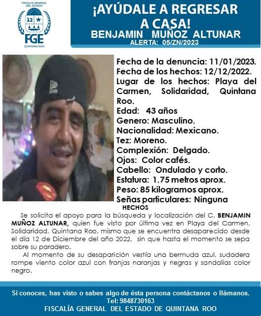 Benjamín Muñoz Altunar de 43 años fue visto por última vez por sus familiares el pasado 12 de diciembre de 2022 en Playa del Carmen, municipio de Solidaridad en Quintana Roo.
