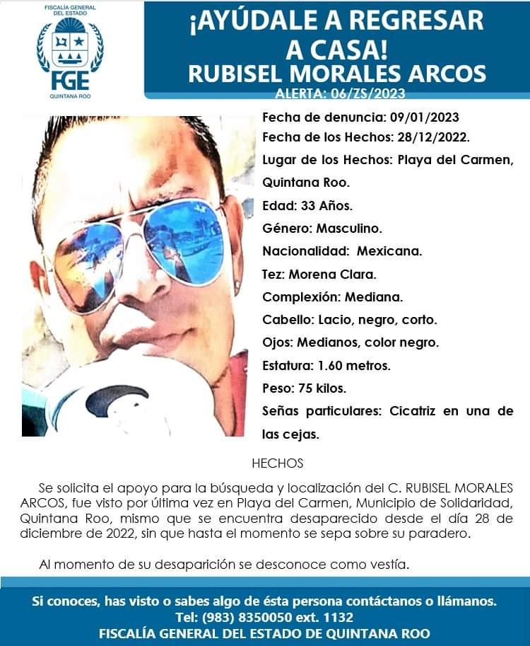 Rubisel Morales Arcos de 33 años fue visto por última vez por sus familiares el pasado 28 de diciembre en Playa del Carmen, municipio de Solidaridad en Quintana Roo.