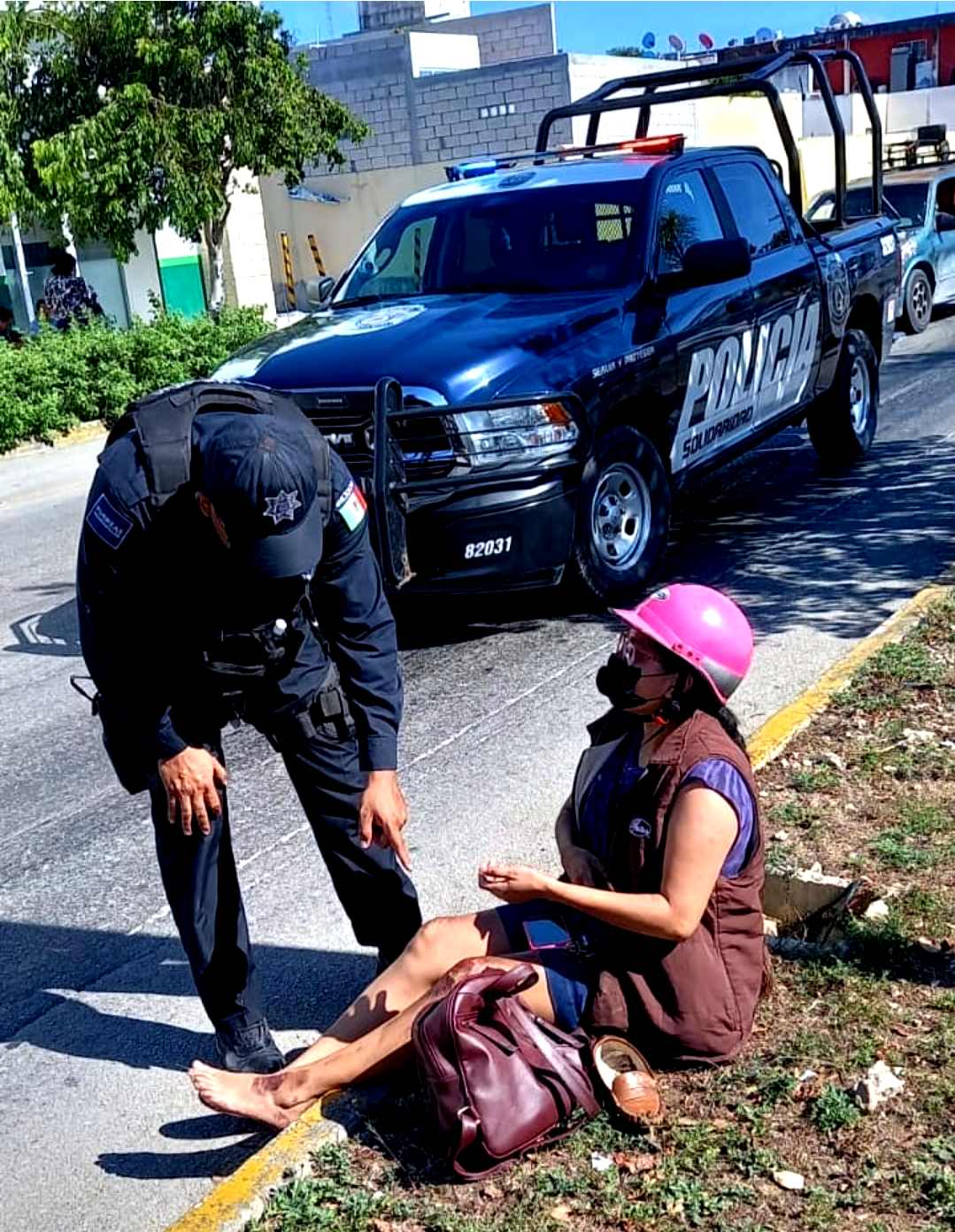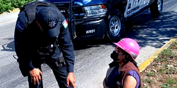 Por suerte, al paso circulaban elementos de la Policía Municipal de Solidaridad a bordo de la patrulla 82031, quienes se detuvieron para brindarle apoyo.