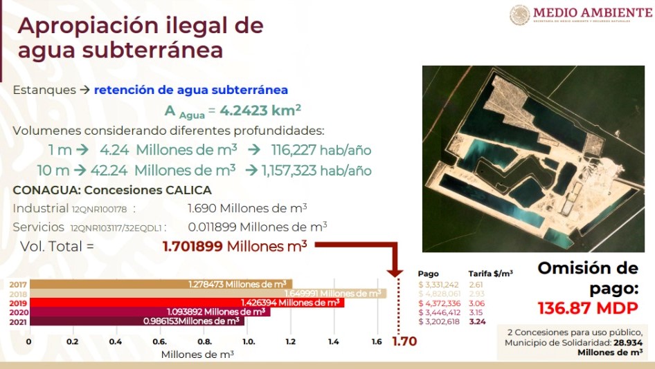 La Semarnat reveló en un dictamen ambiental que realizó tras la clausura de la empresa de capital estadounidense, que retuvo agua subterránea en varios estanques, considerando varios volúmenes, para un total de 1.791899 millones de metros cúbicos y que se traduce en una omisión de pago por 136.87 millones de pesos.