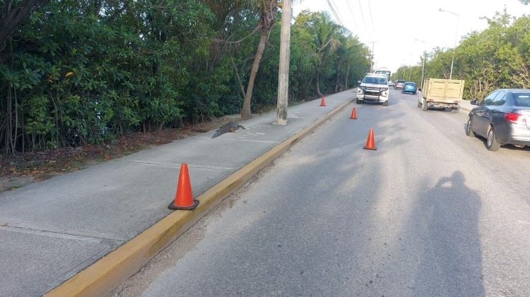 El cocodrilo fue captado por personas que circulaban por la carretera que conduce al casco antiguo de Puerto Morelos, por lo que dieron aviso al 911.