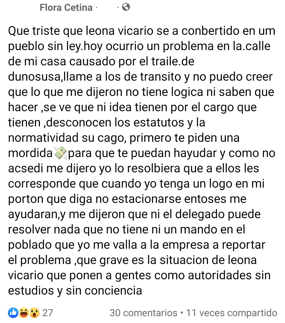 La ciudadana Flora Cetina, público en un mensaje la forma en la que elementos de tránsito le exigían dinero, mediante la famosa “mordida” para poder intervenir en la situación que estaba afectando a esta ciudadana.