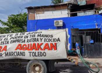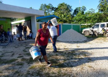 El regidor Marciano Toledo y el presidente de Vecinos Unidos A.C, Marcos Antonio López Díaz, reparten agua en pipas por ...