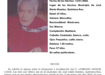 Laureano Moguel Canté de 69 años fue visto por última vez por sus familiares el pasado 13 de enero de ...