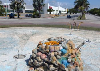 Una fuente ubicada en una rotonda detrás de Plaza las Américas en Playa del Carmen fue vandalizada y robaron sus ...