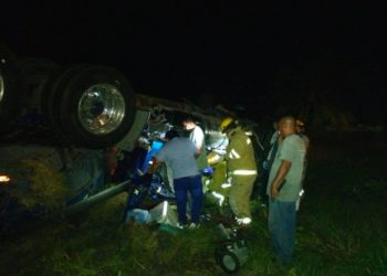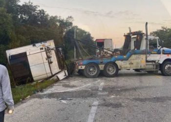 Un tráiler con fierros se volcó sobre la carretera federal 307, a la altura del kilómetro 19 del tramo Chetumal-Bacalar, ...