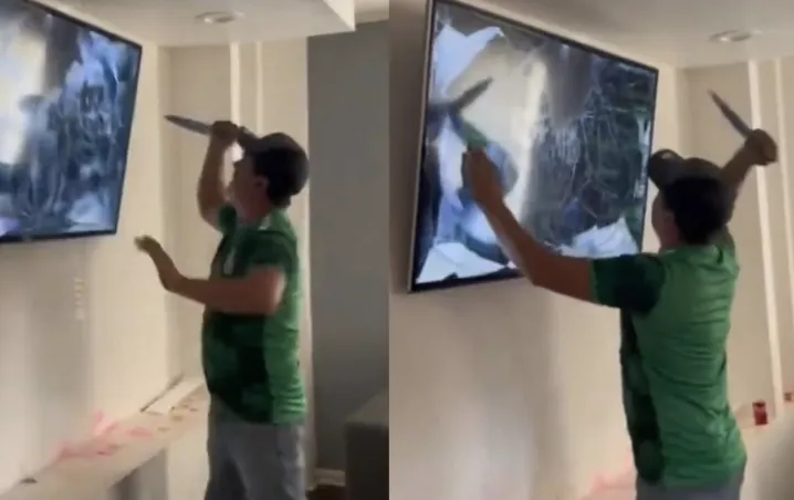 Fue tanta la ira del aficionado, que se ve como sale del cuadro de la cámara por unos segundos y reaparece con un cuchillo en la mano, mismo con el que apuñaló en varias ocasiones la televisión.
