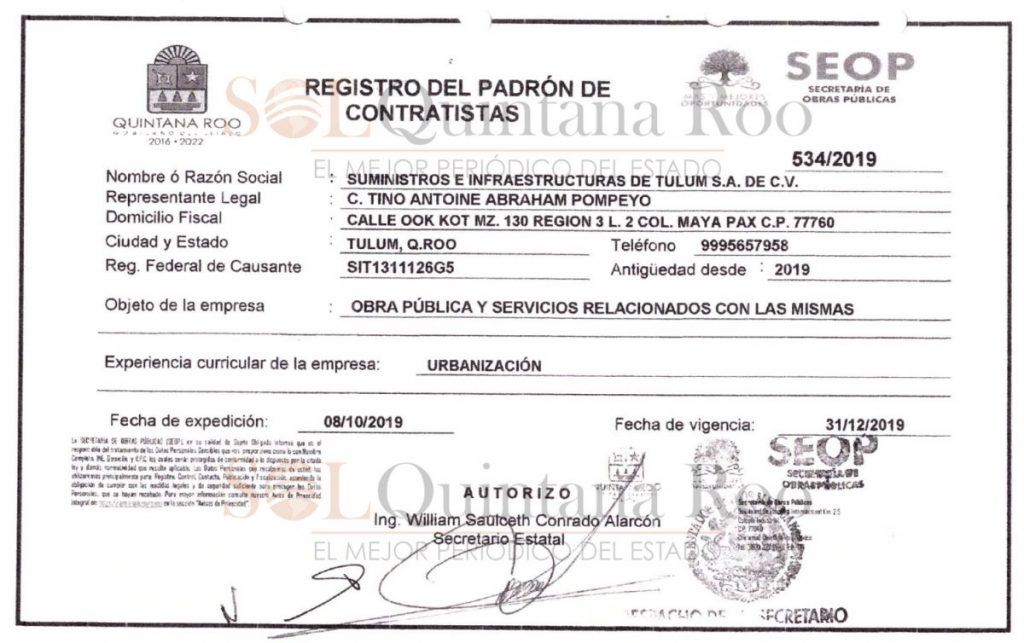 Para esconder el desprestigio de sus empresas ha adquirido obras en Tulum utilizando el nombre de su cómplice Jesús Roberto Lada Jiménez, quien ha firmado tres contratos como persona física por las obras tres obras.