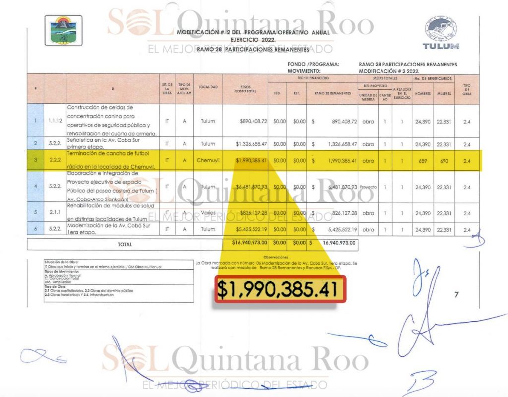 A Jesús Roberto Lada Jiménez, con Registro Federal de Contribuyentes LAJJ8606026EA, se le adjudicó el contrato HAT/DGOYSPM/COP3P/027/REM-R28/2022 por un monto de 1 millón 990 mil 385 pesos para “Terminación de cancha de futbol rápido en la localidad de Chemuyil” municipio Tulum. Los trabajos en ninguna de sus formas, pudo alcanzar ese monto exorbitante de dinero pues solo consistió en un leve remozamiento, lo que enfureció a los vecinos, por eso nunca fue publicitada la supuesta obra.
