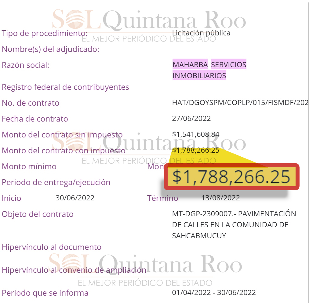 A la fecha, Maharba Servicios Inmobiliarios SA de CV, recibió el contrato HAT/DGOYSPM/COPLP/015/FISMDF/2022 por un monto de 1 millón 788 mil 266 pesos por la supuesta pavimentación de calles en la comunidad de Sahcabmucuy.