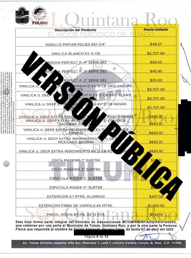 Sin embargo, dentro de la ficha del contrato en la Plataforma Nacional de Transparencia (PNT) se pudo acceder al nombre del proveedor, quien fue contratado por el municipio de Tulum para la “Adquisición de pinturas, solventes, insumos y accesorios relacionados para las instalaciones administrativas del municipio”.