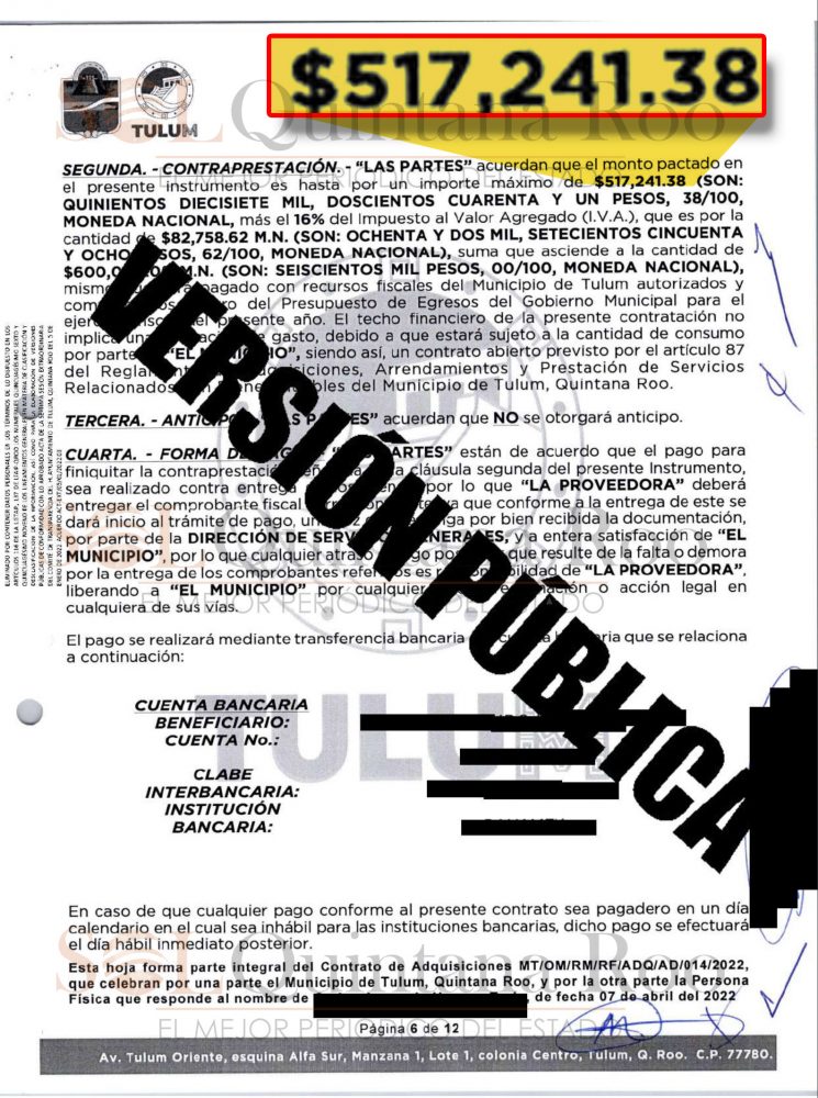 Ya no hay duda que Marciano Dzul está desesperado por reunir recursos para las próximas campañas electorales, claramente esto quedó registrado dentro del contrato de adquisiciones MT/OM/RM/RF/ADQ/AD/014/2022 celebrado el 7 de abril de 2022, entre el municipio de Tulum, representado por su presidente municipal; acompañado de Diego Castañón Trejo, tesorero municipal; Bernabé Antonio Miranda Miranda, oficial mayor; Edwin Armando Caamal Cámara, director de Servicios Generales; y, por otra parte, la persona física de nombre Carlos Armando Herrera Trejo.