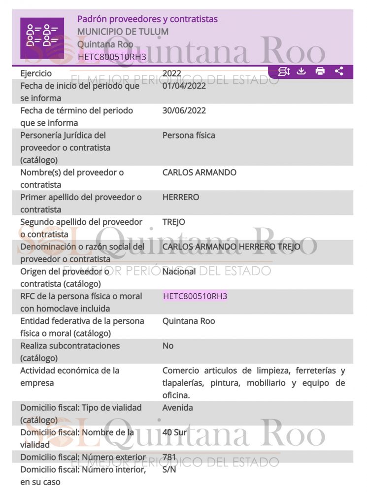 Hasta antes de este contrato, nunca había formado parte de los proveedores del municipio de Tulum y nuevamente no se explica la decisión del edil Marciano Dzul de comprarle pinturas a una persona de Cozumel, en lugar de algún empresario local.