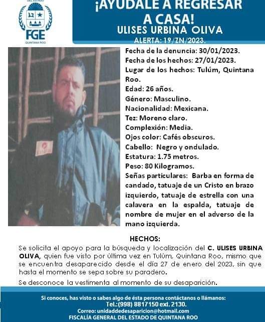 Ulises Urbina Oliva de 26 años fue visto por última vez por sus familiares el pasado 26 de enero de 2023 en Tulum, Quintana Roo.