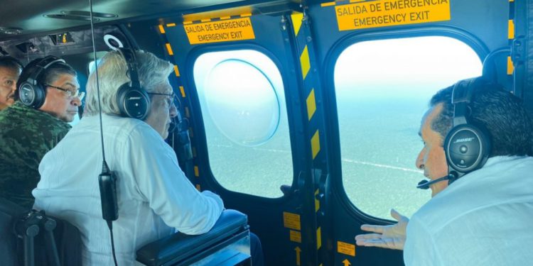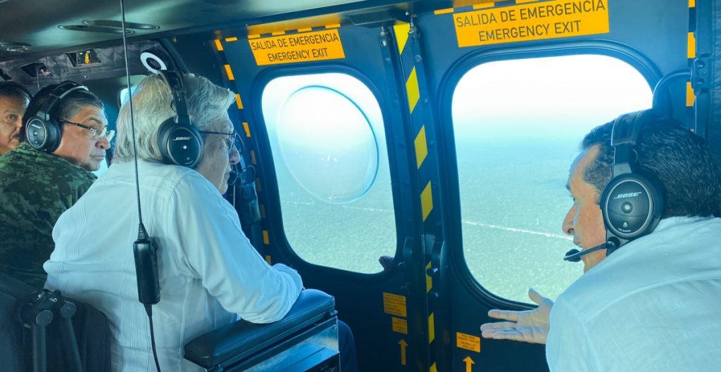El presidente Andrés Manuel López Obrador fue acompañado en su gira por personal del Fonatur y Semar tras el sobrevuelo, y retorna este mismo día a la Ciudad de México