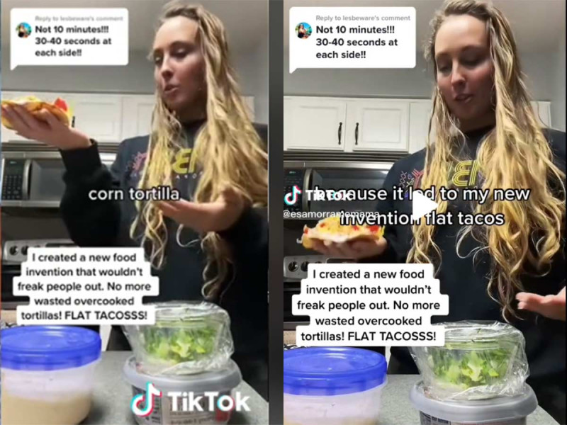 Y es que la chica llamada Nicole compartió un video en Tiktok en el que se ve maravillada al señalar que había inventado el primer taco plano del mundo.