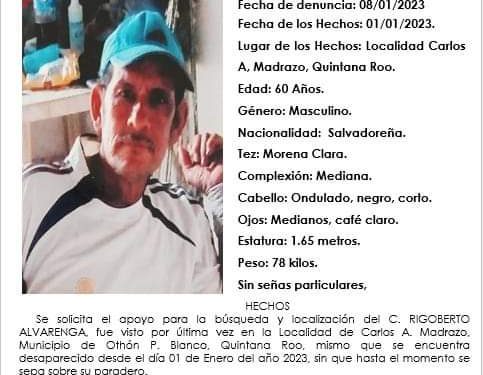 Rigoberto Madrigal de la Cruz de 60 años fue vista por última vez por su familia el pasado 1 de enero de 2023 en Carlos A. Madrazo, Mpio. Othón P. Blanco, Quintana Roo.