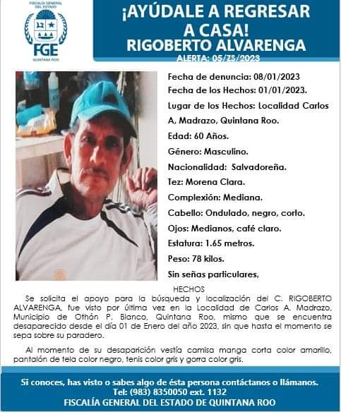 Rigoberto Madrigal de la Cruz de 60 años fue vista por última vez por su familia el pasado 1 de enero de 2023 en Carlos A. Madrazo, Mpio. Othón P. Blanco, Quintana Roo.