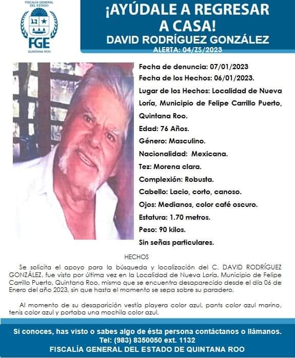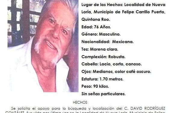 David Rodríguez González de 76 años fue visto por última vez por sus familiares el pasado 6 de enero de 2023 en Nueva Loría en Felipe Carrillo Puerto; Quintana Roo.