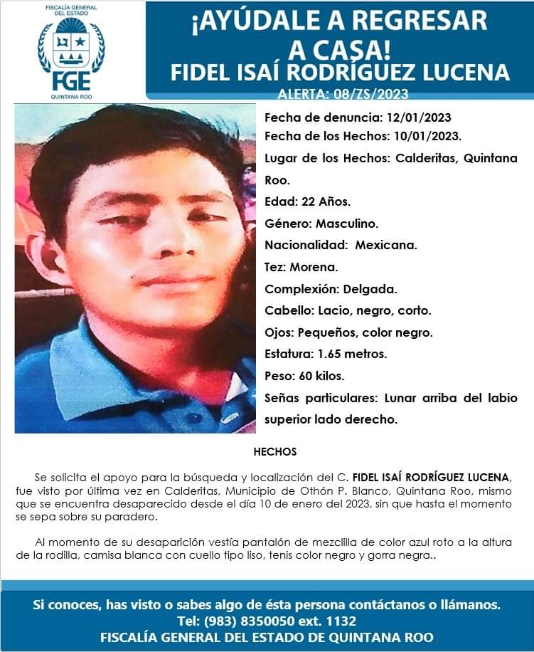 Fidel Isaí Rodríguez Lucena de 22 años fue visto por última vez por sus familiares el pasado 10 de enero de 2023 en Calderitas, municipio de Othón P. Blanco en Quintana Roo.