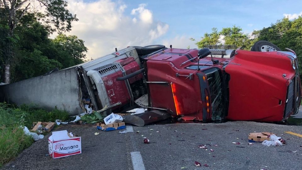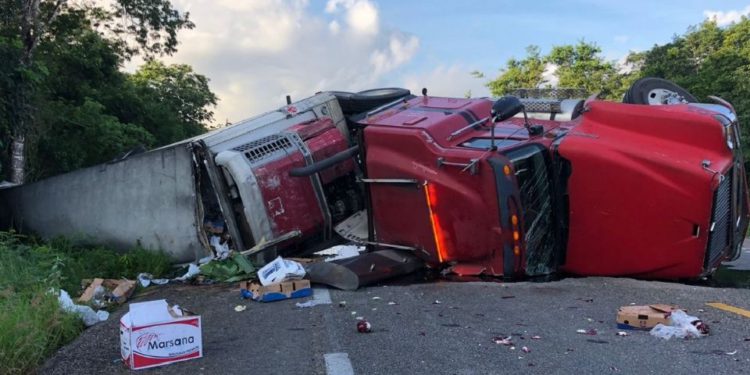 Cuantiosas pérdidas y un conductor con algunos golpes, fue el saldo de una aparatosa volcadura de una pesada unidad cargado de frutas y verduras a unos kilómetros de un poblado de la zona maya de Quintana Roo.